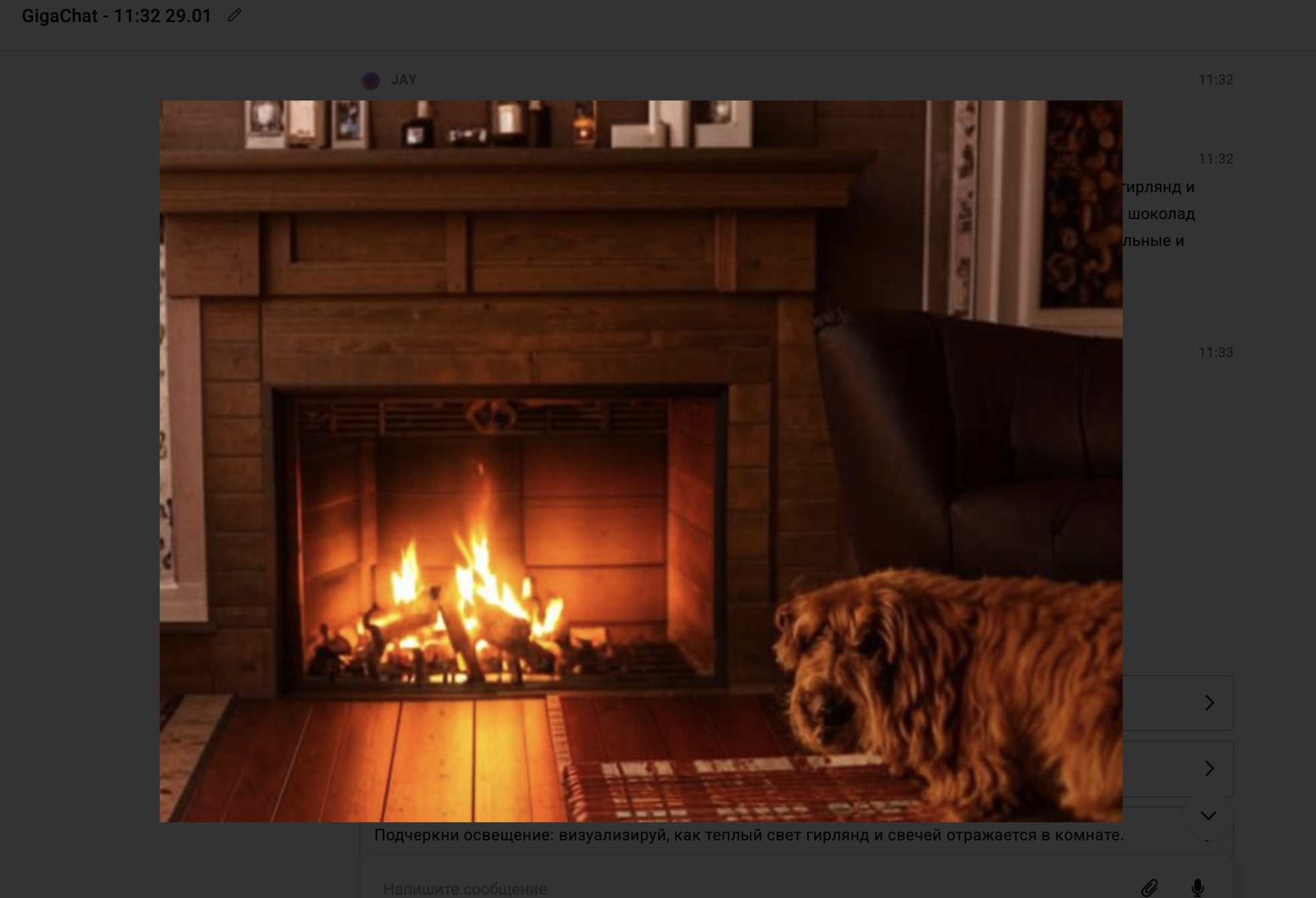 «Нарисуй камин с мягким огнем, уютная деревянная комната в загородном доме, теплый свет гирлянд и свечей. Большая пушистая собака лежит у камина, свернувшись клубком, рядом стоит горячий шоколад с зефирками. Атмосфера тепла, уюта и покоя. Цвета — насыщенные золотые, медовые, карамельные и теплые красные оттенки»