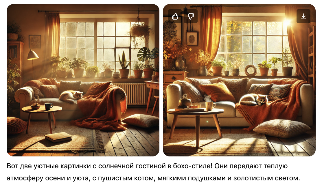 «Теплый солнечный свет проникает через большое окно, заливая уютную гостиную мягкими золотистыми лучами. В центре комнаты — большая мягкая софа, на которой сидит кот, свернувшись клубком. Повсюду теплые осенние оттенки: оранжевые пледы, деревянный стол с чашкой какао и книгой. Интерьер выполнен в стиле бохо, с уютными подушками и растениями в керамических горшках. Атмосфера уюта и спокойствия»